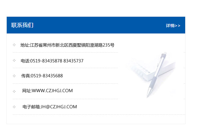 傳真:0519-83435688    郵編:213135    網址:WWW.czjhgj_com.ysu9712.com    電子郵箱:JH@czjhgj_com.ysu9712.com